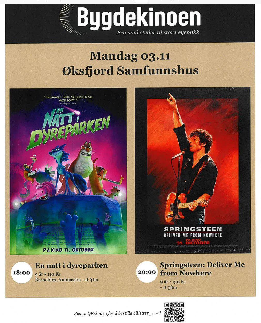 Kino på Øksfjord samfunnshus mandag 3. november 2025Velkommen på kino i Øksfjord; Barnefilm kl. 18: 00 og film for de litt eldre kl. 20:00 med aldersgrense 9 år. Publisert 23.10.2025 15:38 Sist endret 23.10.2025 15:38