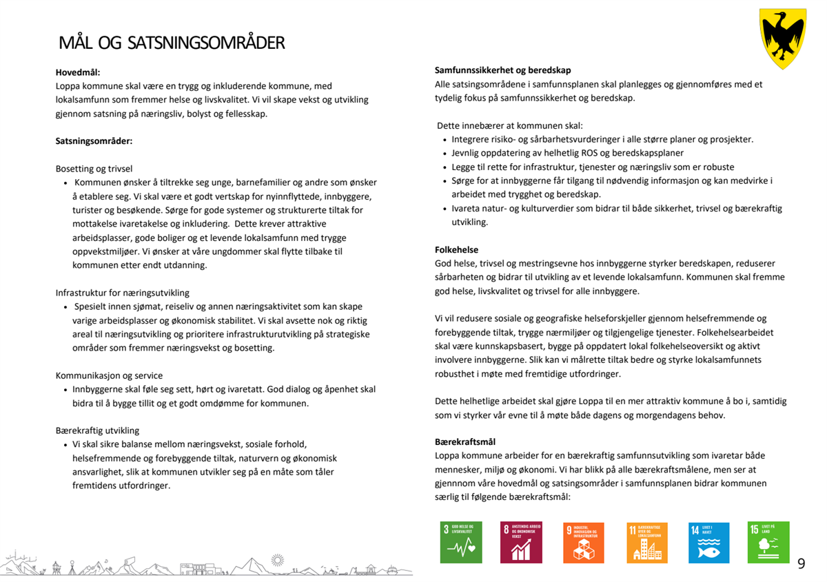 Samfunnsdelen er ikke bare et dokument for kommunen som organisasjon, men en plan for hele lokalsamfunnet. Den skal bidra til forutsigbarhet, langsiktighet og en felles forståelse av hvilken retning vi ønsker å utvikle kommunen i.
